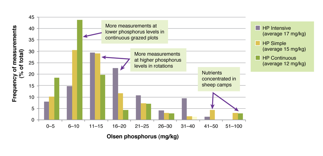 Continuous grazing resulted in transfer of plant nutrients towards sheep camp areas while nutrients were more evenly distributed in Intensive rotation paddocks (Figures, 9, 10 and 11). The distribution of nutrients was significantly correlated with the distribution of faeces meaning that differences were a result of stock transfer.