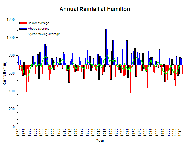 Figure 3. Annual, autumn, spring and summer rainfall variation at Hamilton (1870-2010). Click on the image to enlarge in a new window/tab. Close the window/tab to return to this page.