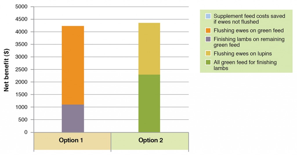 - Option 2 calculates the return from flushing ewes by feeding lupins (or maintaining ewes with cereal grain), and using the whole area of green feed for finishing lambs.